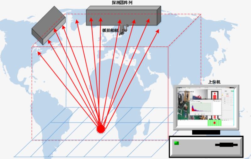 RJ24-D核輻射定位系統主要由陣列式高靈敏輻射探測器和高速圖像采集攝像頭以及上位機軟件三部分組成。后臺系統將采集到的信號的位置信息、強度信息和坐標方位經過計算后與圖像信息進行符合疊加,并在1秒的時間內給出攜帶放射性人員的位置與照片信息,同時多道分析器將給出放射源的核素類型,實現攝像頭所呈現的視像之內危險源一目了然的效果。系統具有對檢測數據進行管理、分析與儲存,以及報警輸出的功能,同時可構建遠程實時的檢測信息共享平臺。