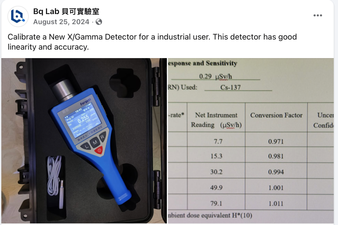 貝可實驗室作為香港專業的輻射檢測公司,其對外采監測設備的精度、穩定性及合規性有著嚴苛標準。由貝可實驗室Facebook官方平臺發布的歷史消息顯示,貝可實驗室對上海仁機脈沖X、γ脈快速檢測儀進行測試,該探測器的線性度與精確度皆有良好的表現。不僅是對 “中國智造” 在核安全領域技術實力的重要認可,更成為上海仁機全球化布局中的關鍵一步,具體價值與意義可從三方面體現: