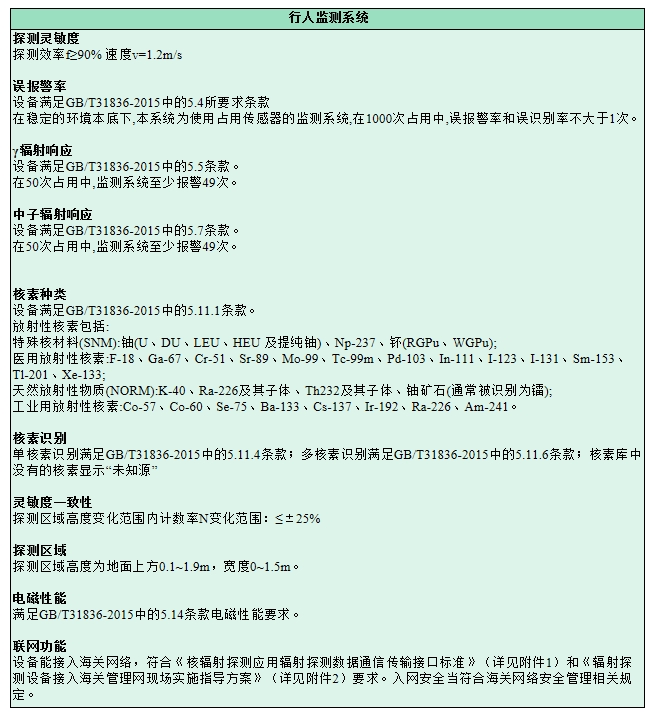 探測器:可進行探測判斷γ射線和中子源的存在,對行人體內或行人攜帶的γ核素種類可進行識別;固定式行人輻射探測設備采用雙側探測形式,門式兩側均有γ探測器和中子探測器。非探測面采用有效的屏蔽措施,可保證對本底的有效屏蔽。