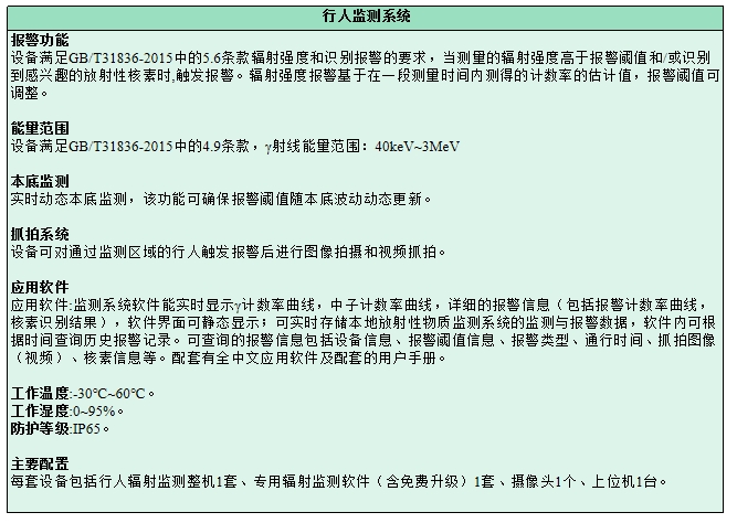 產品簡介:RJ12 行人輻射監測設備是一款對行人進行輻射監測的設備,具有靈敏度高、探測范圍廣、響應時間 短等特點,可實現自動輻射報警、自動數據存